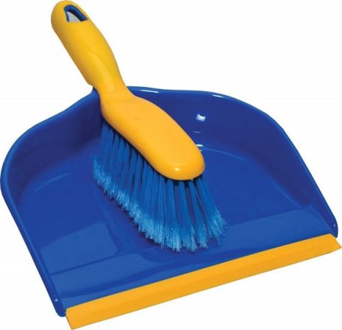 Műanyag szemeteslapát gumi éllel és porkefével, több színben. A képen látható termék csak illusztráció.